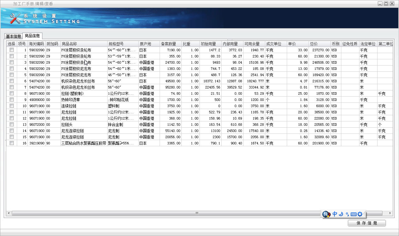 加工厂手册 | 库存查询 | 报关单 | |